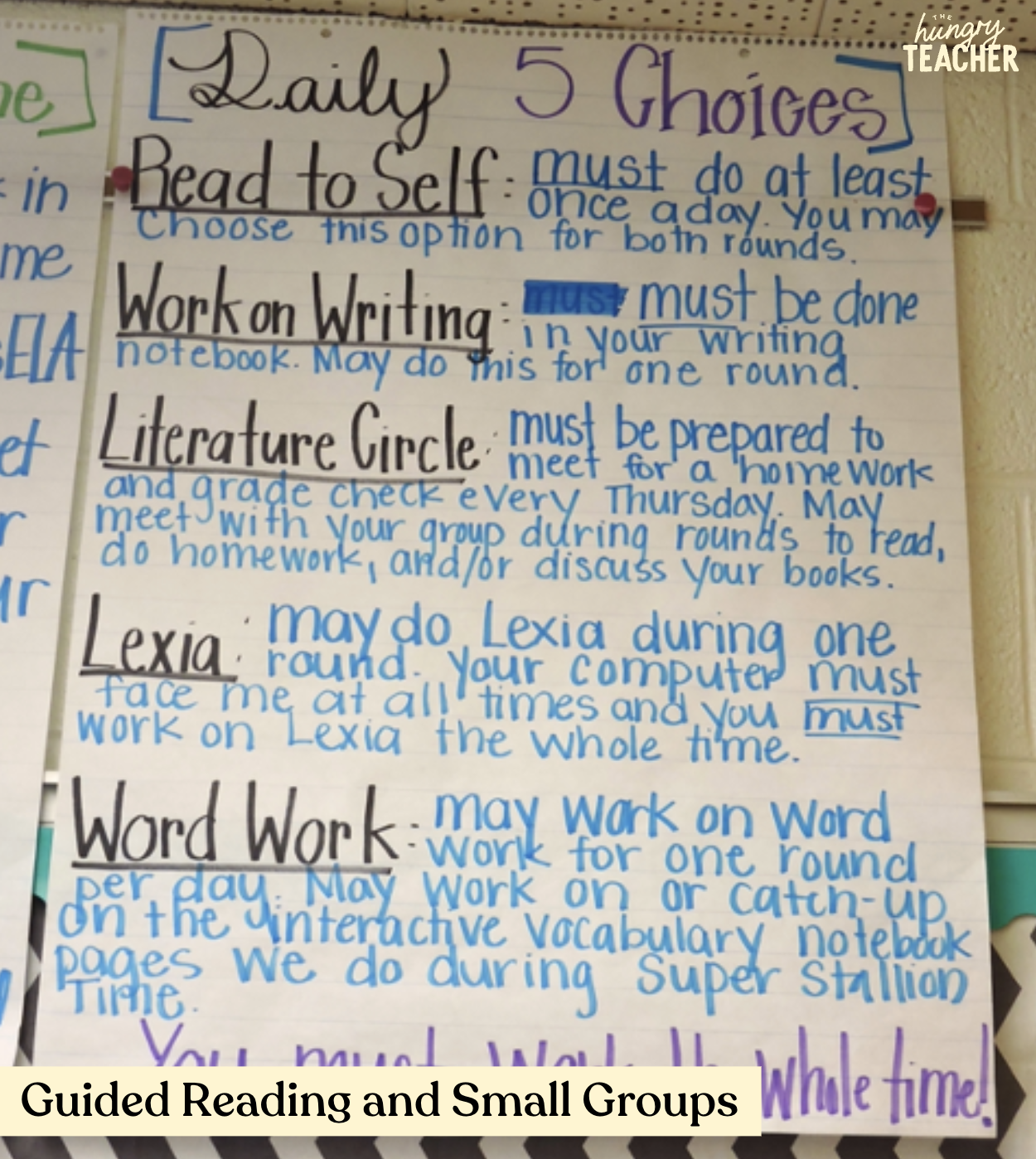 I love your blog, and I could really use some advice! I am an 8th grade ELA teacher and have 47 minute class periods. I am desperate to implement guided reading into my classroom, and my biggest stumbling block at this point is wrapping my head around the scheduling of the class period and week and what the rest of my class is doing while I'm meeting with small groups. I see that your kids have Daily 5 Choices–so once they choose, is that their activity for the remainder of the ELA time? I notice you mentioned in the above comment that you don't like kids moving to different stations during a set time, and I agree. I think that would invite behavior issues that would interfere with my small group time. So would you suggest that I schedule certain students to complete certain stations each day while I meet with small group OR allow them the choice of station or daily 5, but do not allow them to move to more than one station per day. I'm not sure if my question makes sense–my mind is all over the place trying to get this under control so that I can help my readers!! Thank you so very much!!