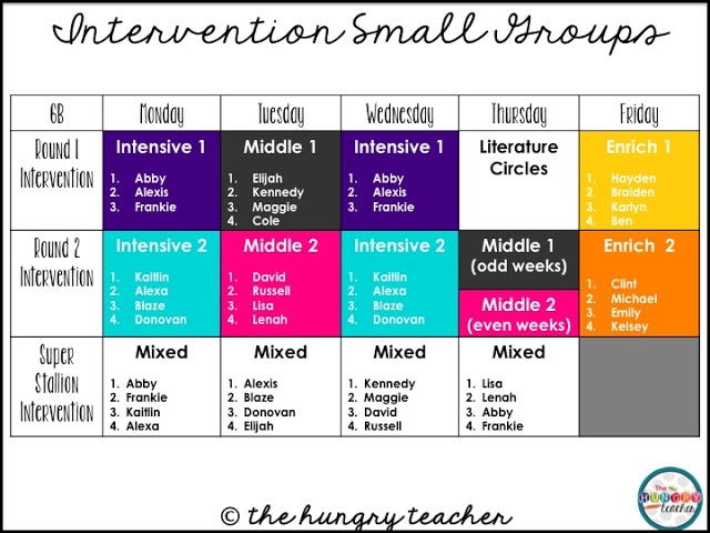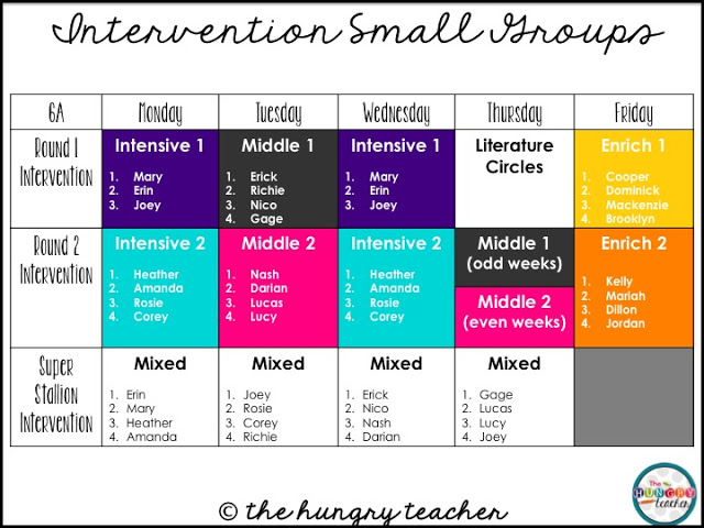 I wanted to meet with my intensive groups at least two times a week, and I typically get to meet with them three times a week, because of our intervention block. This can change if I need to do assessments or work with other students at this time.